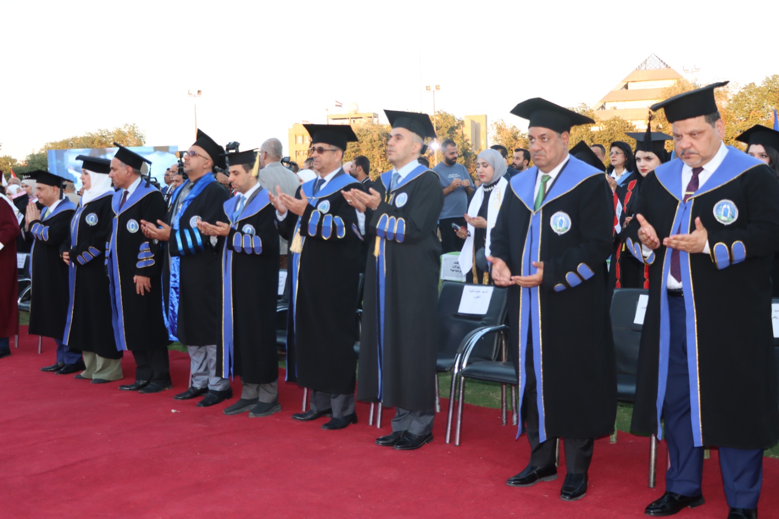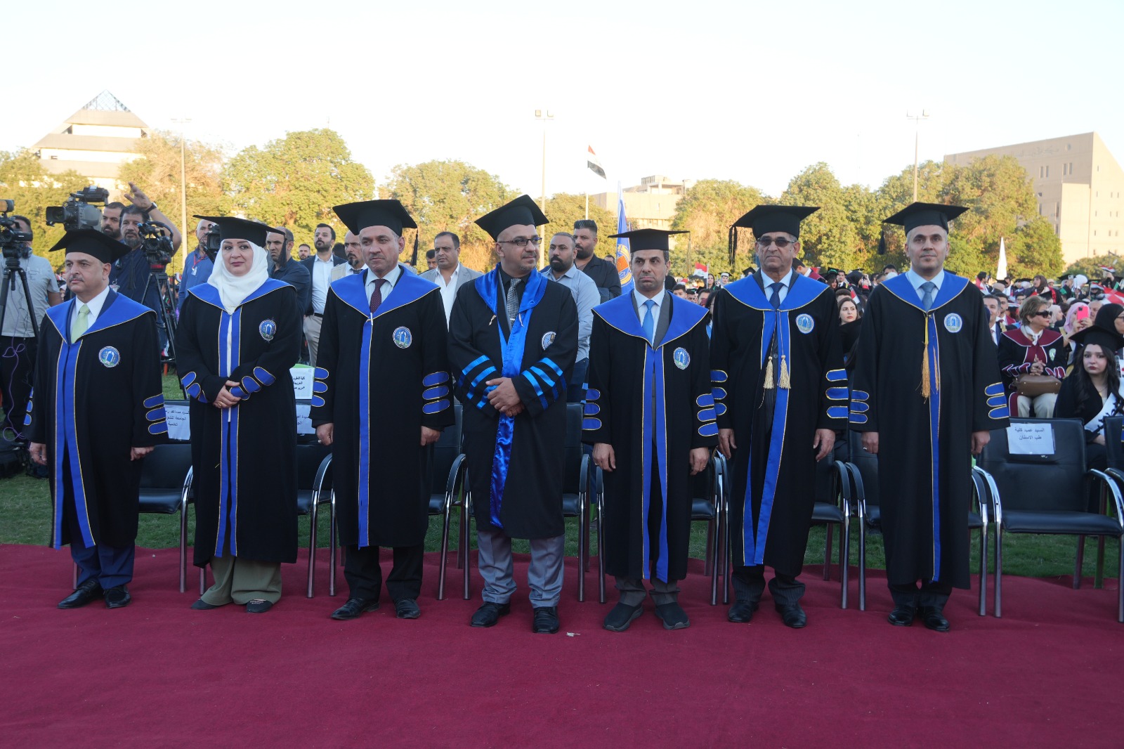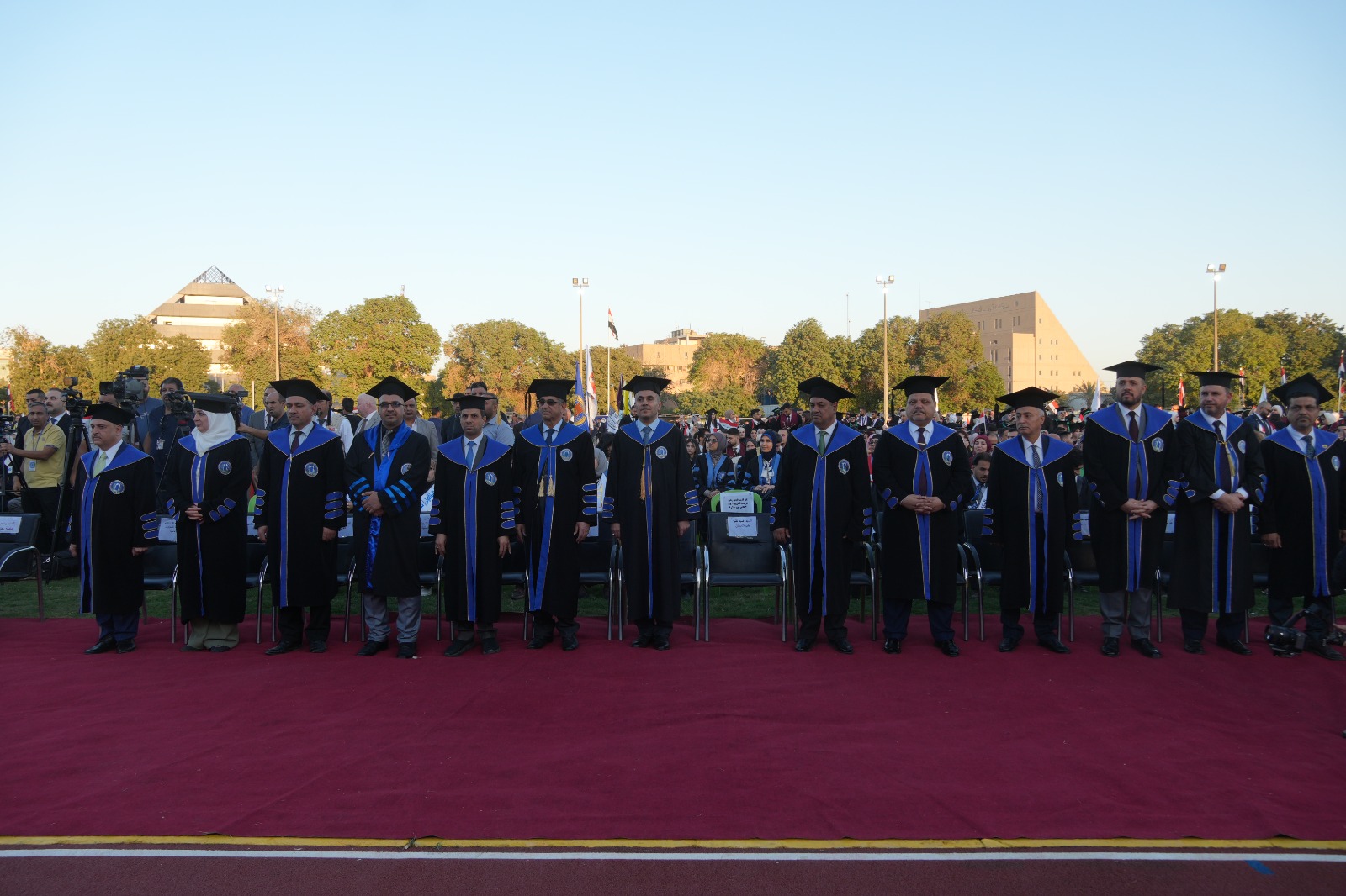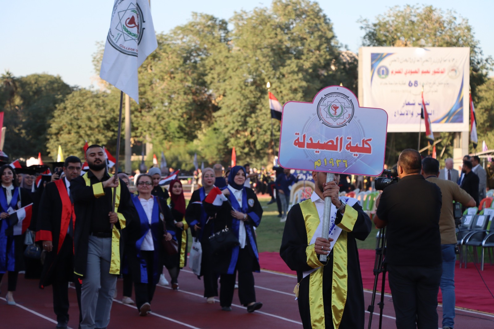 أقيم حفل التخرج المركزي للدورة 68 لخريجي جامعة بغداد للعام الدراسي 2024-2025 (دورة التميز والإبداع) على حدائق كلية التربية البدنية وعلوم الرياضة في الجامعة برعاية السيد رئيس جامعة بغداد الأستاذ الدكتور بهاء ابراهيم انصاف المحترم، وبحضور السيد معالي وزير التعليم العالي و البحث العلمي الدكتور نعيم العبودي المحترم. وقد حضر الحفل السيد عميد الكلية الأستاذ الدكتور سرمد هاشم الخطيب المحترم برفقة السيد معاون العميد للشؤون العلمية الأستاذ الدكتور مناف هاشم عبد الرزاق المحترم و نخبة من تدريسيي الكلية. تضمن الحفل عدة فقرات وأهمها تكريم الطلبة الأوائل من قبل معالي الوزير، وإمتاز الحفل بالمستوى التنظيمي العالي والمتميز. وحرص طلبتنا خريجو دورة 68 على التواجد في الحفل وسط فرحة عوائلهم. وبختام الحفل أشاد السيد العميد بحرص طلبتنا على التواجد متمنياً لهم حياة مهنية مكلَّلة بالنجاح و التميز.