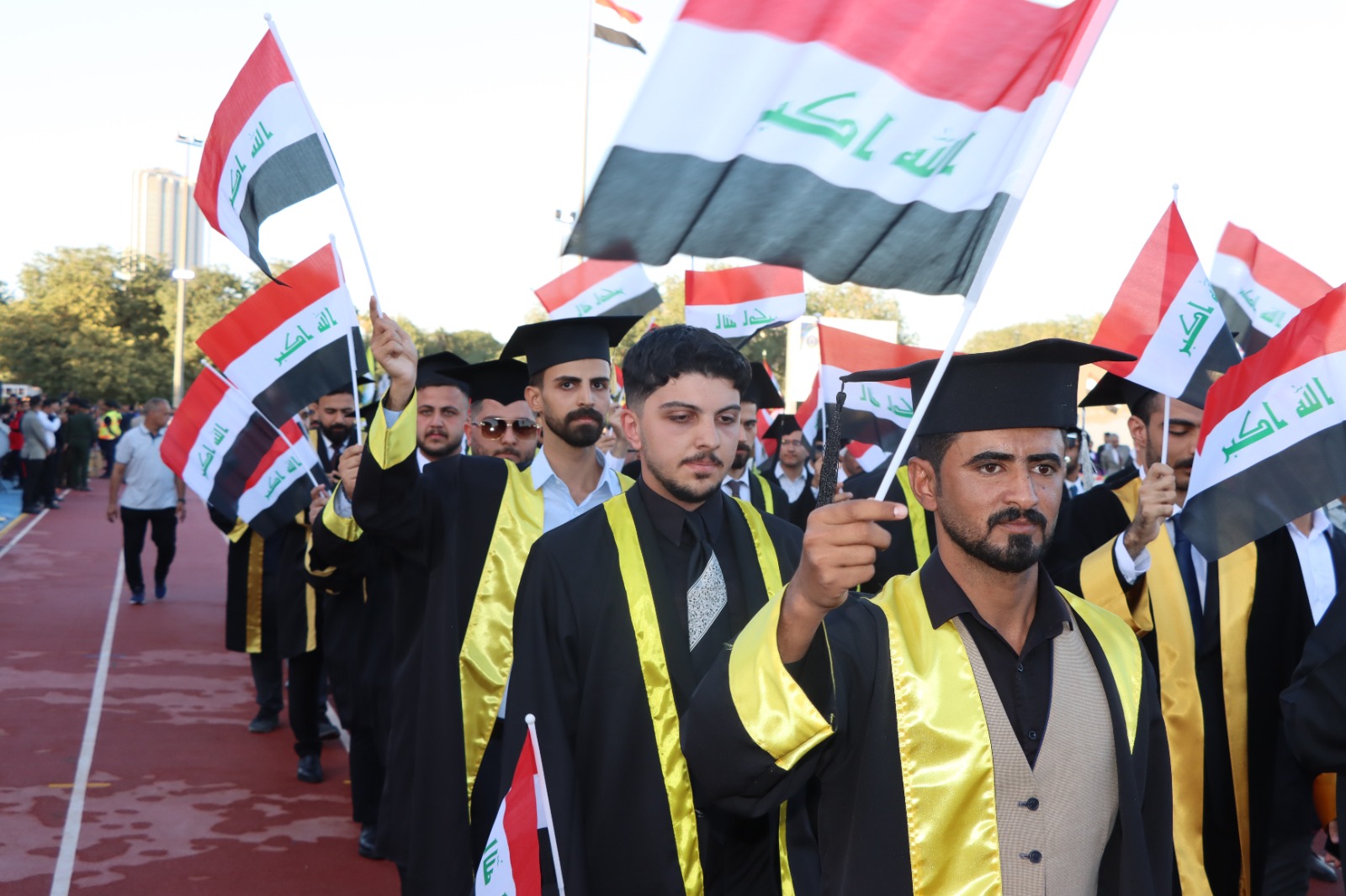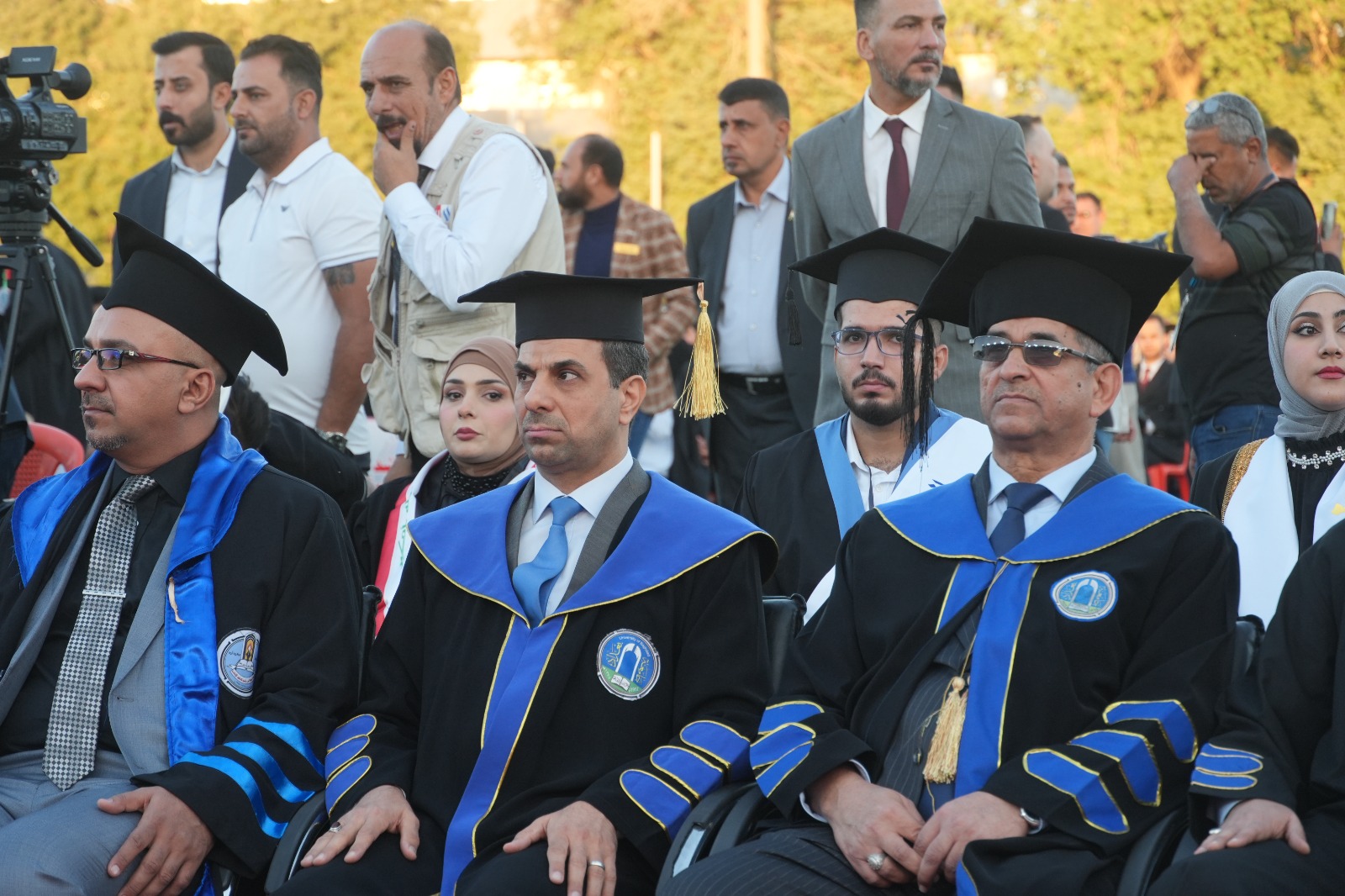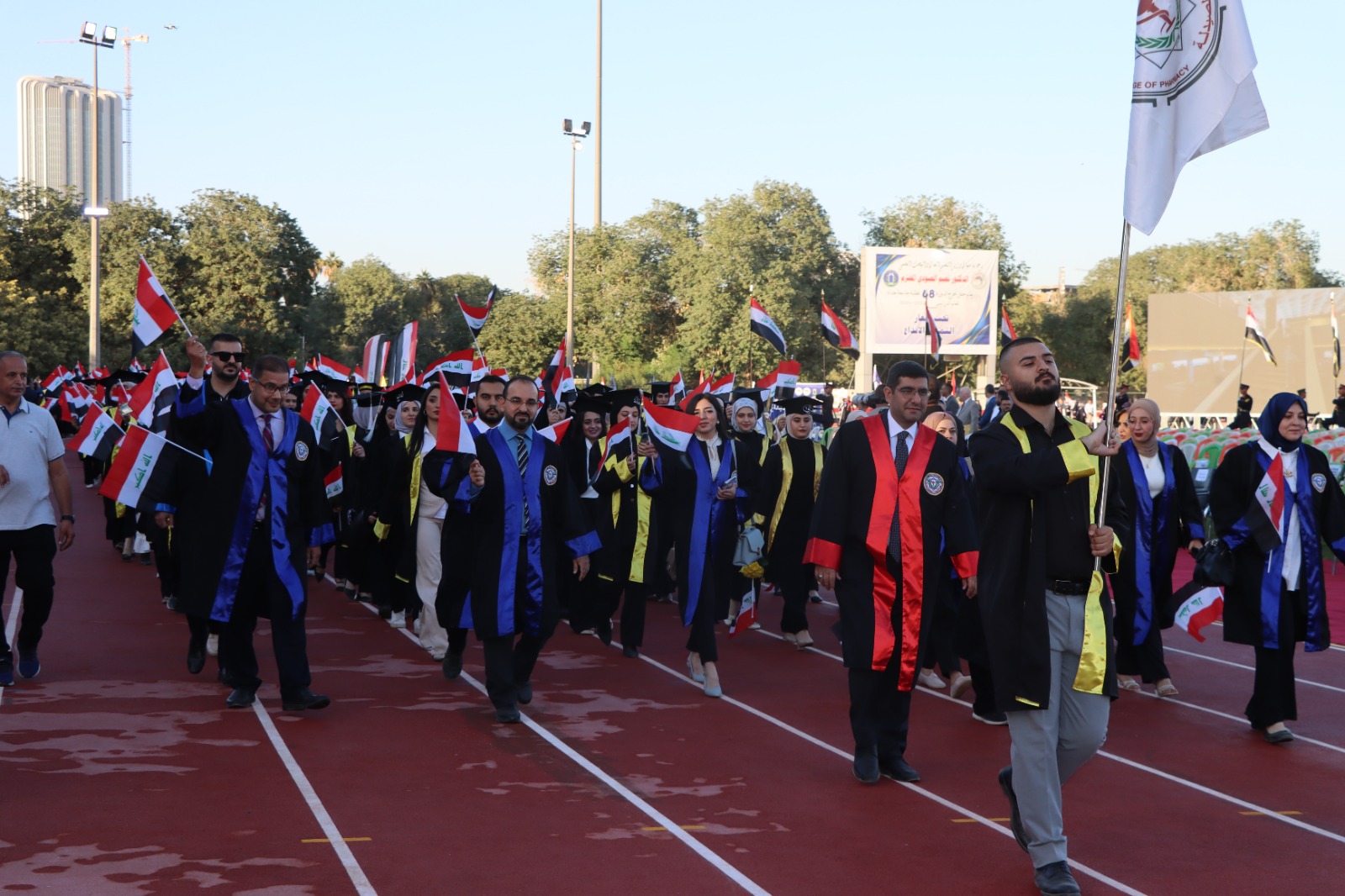 أقيم حفل التخرج المركزي للدورة 68 لخريجي جامعة بغداد للعام الدراسي 2024-2025 (دورة التميز والإبداع) على حدائق كلية التربية البدنية وعلوم الرياضة في الجامعة برعاية السيد رئيس جامعة بغداد الأستاذ الدكتور بهاء ابراهيم انصاف المحترم، وبحضور السيد معالي وزير التعليم العالي و البحث العلمي الدكتور نعيم العبودي المحترم. وقد حضر الحفل السيد عميد الكلية الأستاذ الدكتور سرمد هاشم الخطيب المحترم برفقة السيد معاون العميد للشؤون العلمية الأستاذ الدكتور مناف هاشم عبد الرزاق المحترم و نخبة من تدريسيي الكلية. تضمن الحفل عدة فقرات وأهمها تكريم الطلبة الأوائل من قبل معالي الوزير، وإمتاز الحفل بالمستوى التنظيمي العالي والمتميز. وحرص طلبتنا خريجو دورة 68 على التواجد في الحفل وسط فرحة عوائلهم. وبختام الحفل أشاد السيد العميد بحرص طلبتنا على التواجد متمنياً لهم حياة مهنية مكلَّلة بالنجاح و التميز.
