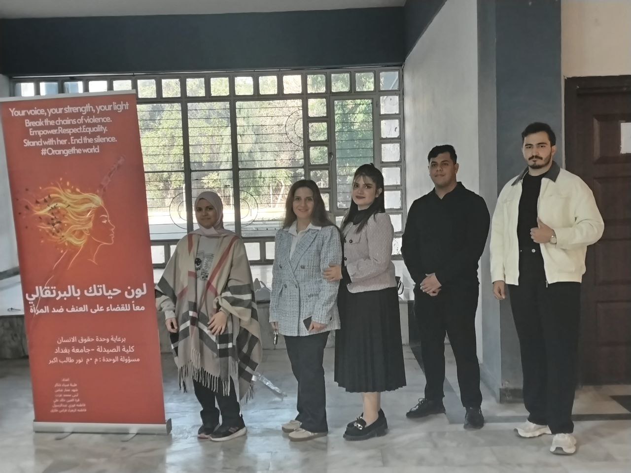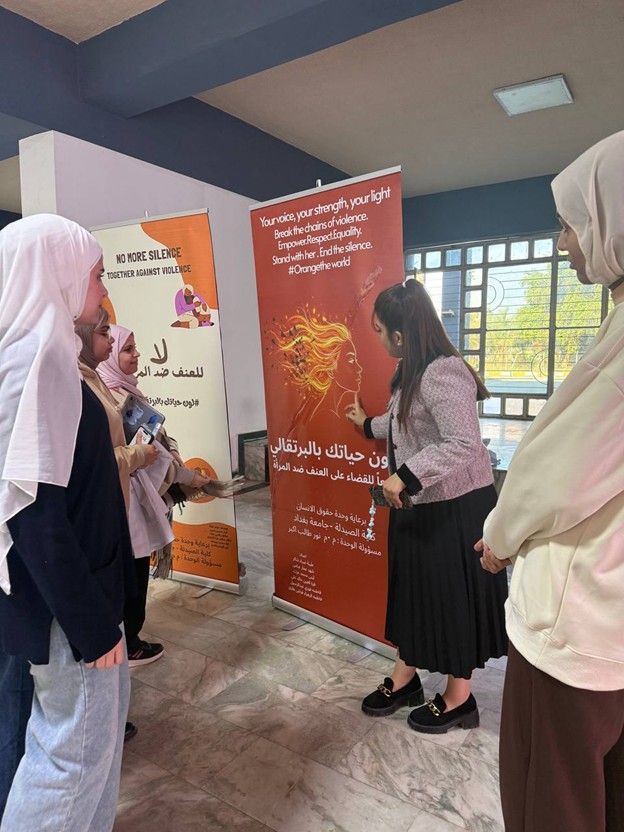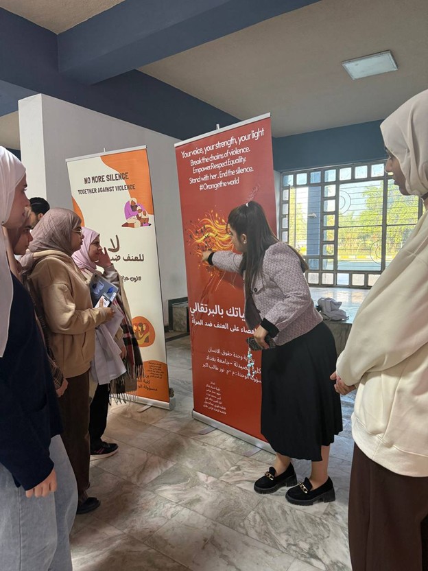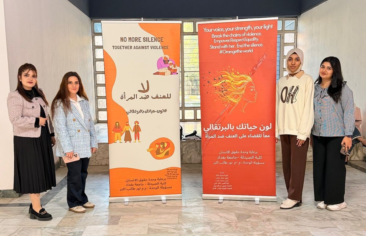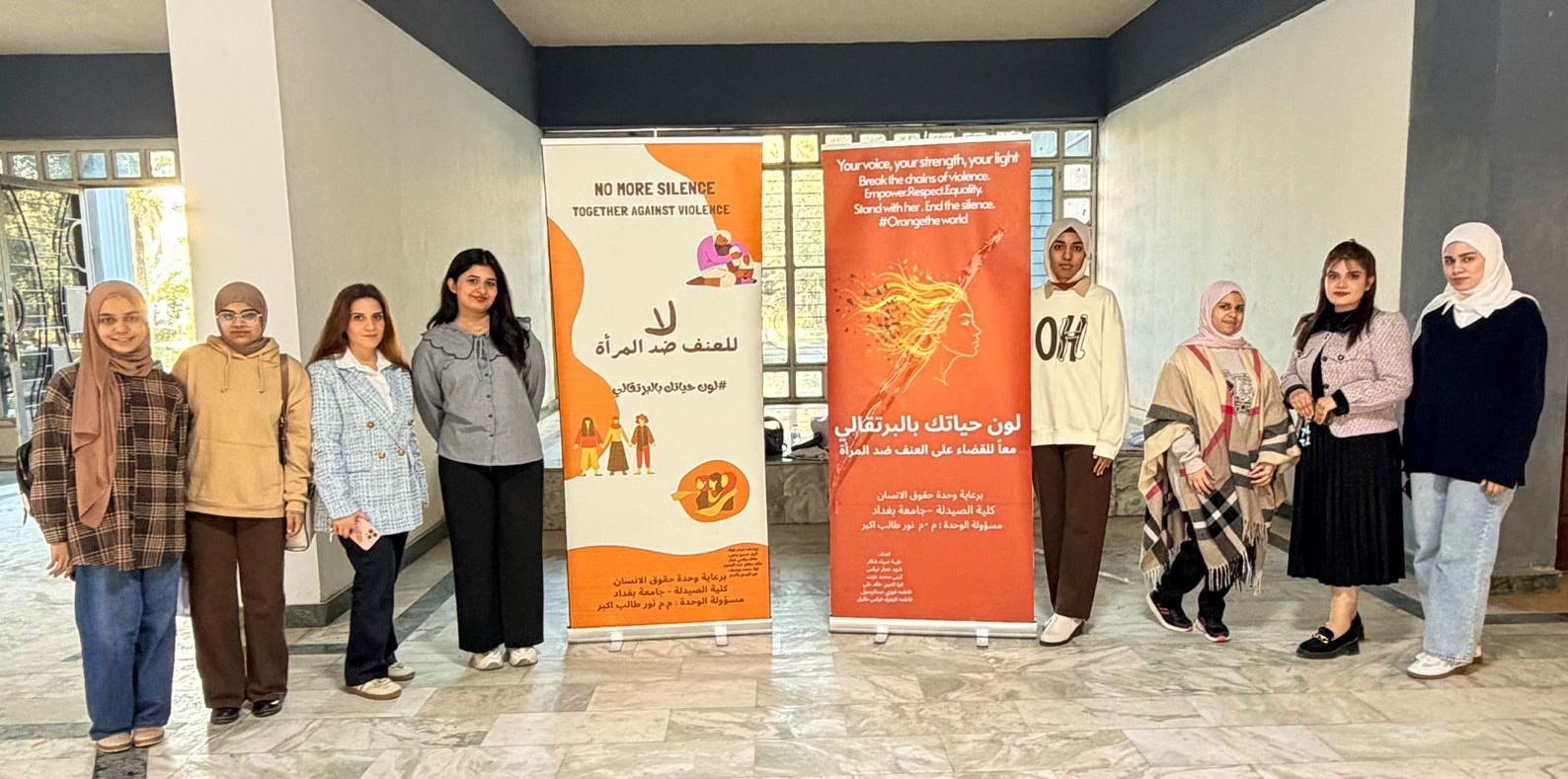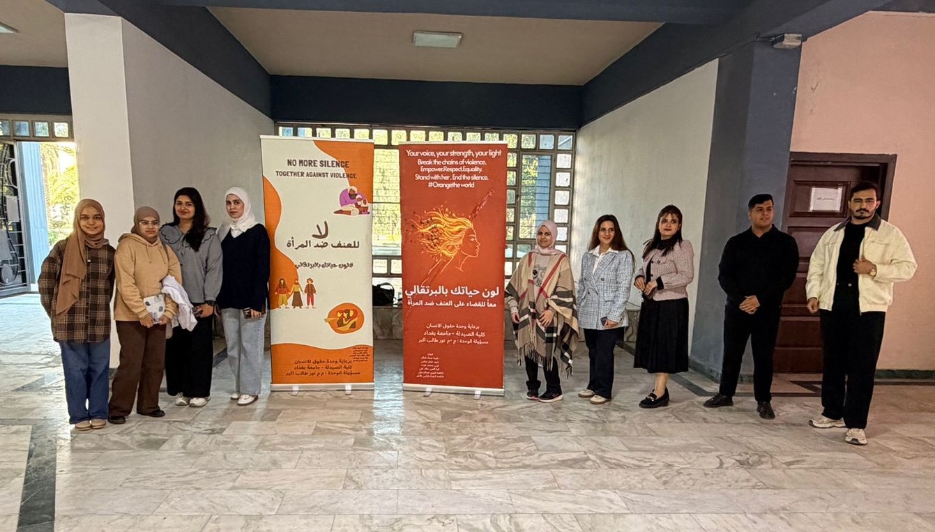 برعاية السيد عميد كلية الصيدلة، الأستاذ الدكتور سرمد هاشم الخطيب المحترم، أقامت وحدة حقوق الإنسان في كلية الصيدلة/جامعة بغداد نشاط توعوي بعنوان “لون حياتك بالبرتقالي بمناسبة اليوم العالمي للقضاء على العنف ضد المرآة ”، في باحة عمادة كلية الصيدلة وشارك في النشاط مجموعة من طلبة المرحلة الثانية، بإشراف مسؤولة الوحدة، المدرس المساعد نور طالب أكبر. هدف النشاط إلى نشر الوعي بخطورة العنف ضد المرأة وتشجيع المجتمع على دعم النساء وتبنّي ثقافة إحترام وحماية المرأة، من خلال إستخدام اللون البرتقالي كرمز للأمل ومستقبل خالٍ من العنف. وتضمّن النشاط عرض بوسترات توعوية ومناقشة عدد من الموضوعات المتعلقة بفهم ، وسبل دعمهم داخل الحرم الجامعي، وتم التحدث عن معنى اللون البرتقالي ورمزيته في حملات مناهضة العنف ضد المرأة باعتباره رمزًا للأمل والتفاؤل. ومناقشة أنواع العنف التي قد تتعرض لها المرأة. و تبادل آراء المشاركين حول أسباب انتشار العنف وطرق الحدّ منه داخل المجتمع. وأختتم النشاط بالتأكيد على دور المؤسسات التعليمية والأسرة في دعم المرأة وتعزيز ثقافة الإحترام وعدم التمييز.