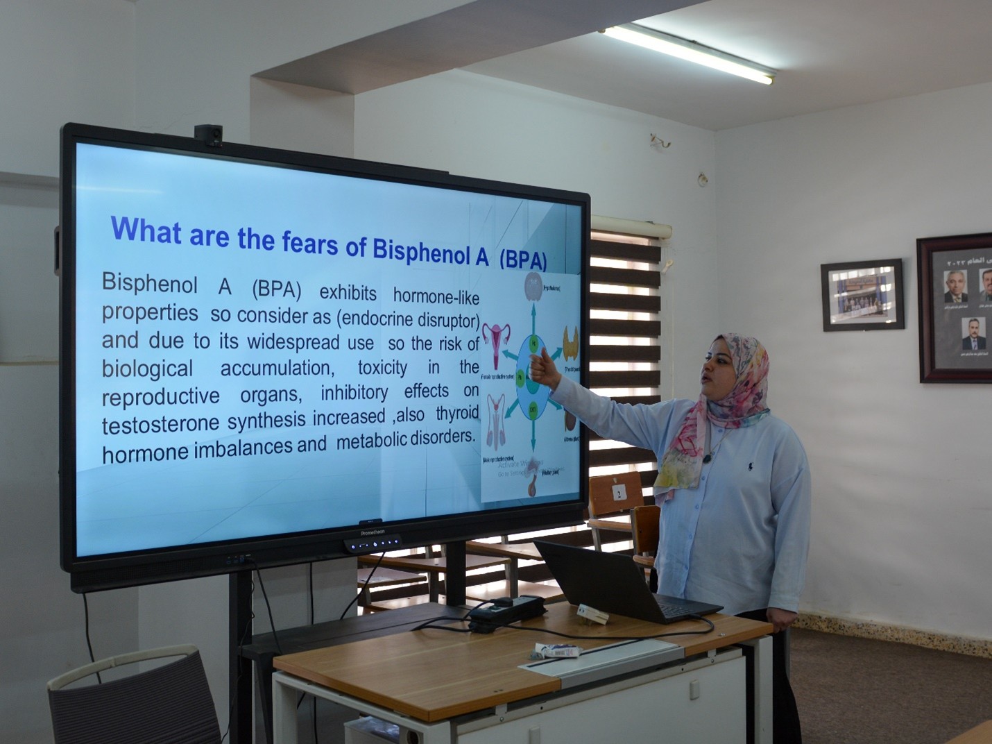 بإشراف السيد عميد كلية الصيدلة الأستاذ الدكتور سرمد هاشم الخطيب المحترم، أقامت وحدة الشؤون العلمية في كلية الصيدلة/ جامعة بغداد حلقة نقاشية حضورية بعنوان ” مادة ثنائي الفينول والسرطانات المرتبطة بالهرمونات: التقدم الحالي والآفاق المستقبلية”، ألقتها طالبة الدكتوراه زينة تحسين علي في فرع الصيدلة السريرية هدفت المحاضرة إلى تعريف الحضور بمخاطر مادة ثنائي الفينول وآخر ماتوصلت اليه الدراسات بما يخص المادة وكيفية الحماية منها و طرق التقليل من مخاطرها. تضمنت المحاضرة عدة محاور منها التعريف بمادة ثنائي الفينول، طرق التعرض لها ومدى إنتشارها، ماهي المخاوف منها وماهي مخاطرها وعلاقتها بالإصابة بأنواع مختلفة من السرطانات بالإضافة الى علاقتها بالأمراض الأيضيةولخصت المحاضرة الى ضرورة إستخدام مواد بلاستيكية خالية من المادة ويرمز لها تجاريا ب BPA free. كما ويجب تثقيف الأمهات لشراء قناني الحليب التي تكون معتمة او ملونة والإبتعاد عن الشفافة منها ،عدم إستخدام غسالات الصحون لتنظيف حافظات الطعام او العلب التي تحتوي على المادة لان الحرارة تزيد من سميتها بالإضافة الى وجوب الإبتعاد عن محضرة القهوة الجاهزة لنفس السبب.
