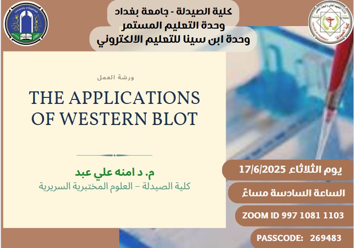 بإشراف السيد عميد كلية الصيدلة الأستاذ الدكتور سرمد هاشم الخطيب المحترم، أقامت وحدة التعليم المستمر في كلية الصيدلة/ جامعة بغداد ورشة عمل الكترونية بعنوان “تطبيقات لطخة ويسترن”، قدمتها المدرس الدكتورة آمنه علي عبد، التدريسية في فرع العلوم المختبرية السريرية.