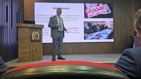 من جانبه، قدم الدكتور علي عزيز عرضاً بحثياً لرسالة الماجستير الخاصة بطالبته الصيدلانية سارة حازم والتي نشرت في مجلة بريطانية من الربع الثاني في مستوعب سكوبس ، والتي تناولت العوامل المؤثرة في تقبل المرضى المدمنين للعلاج وإستمرارهم فيه، والحد من الإنتكاسة والعودة للإدمان. وقد أجريت الدراسة في مركزين لعلاج الإدمان في بغداد: مركز القناة التابع لمدينة الطب، ومركز العطاء التابع لدائرة صحة الرصافة. وشدد المحاضر على أهمية مراجعة المرضى لهذه المراكز دون خوف من أي ملاحقة قانونية، فالغرض الأساسي هو شفاؤهم من آفة الإدمان وعودتهم أفراداً أصحاء ومنتجين في مجتمعهم وأسرهم.