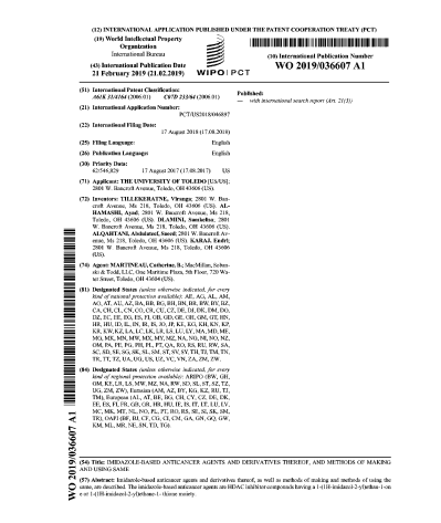 حصل الأستاذ المساعد الدكتور أياد عبد علي، التدريسي في فرع الكيمياء الصيدلانية الى جانب فريق بحثي من الولايات المتحدة الأمريكية على براءة إختراع بعنوان “عوامل مضادة للسرطان قائمة على الإيميدازول ومشتقاتها وطرق تصنيعها وإستخدامها”
