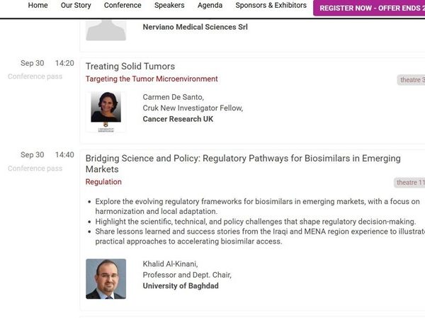 شارك الأستاذ المساعد الدكتور خالد كاظم الكناني، رئيس فرع العقاقير والنباتات الطبية، ممثلاً عن الكلية والعراق في واحد من أبرز المؤتمرات العالمية المتخصصة في الأدوية الحيوية و الذي أُقيم في مدينة بازل- سويسرا للفترة من 30 أيلول – 2 تشرين الأول 2025 بدعوة مباشرة من منظمي المؤتمر.