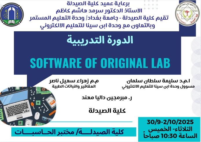 بإشراف السيد عميد كلية الصيدلة الأستاذ الدكتور سرمد هاشم الخطيب المحترم، أقامت وحدة التعليم المستمر في كلية الصيدلة/ جامعة بغداد دورة تدريبية حضورية بعنوان ” Software of Original Lab “، ألقاها كل من أ.م. د سليمة سلمان سلطان و المدرس المساعد زهراء سهيل ناصر حسين و ر. مبرمجين داليا مهند، التدريسيين في كلية الصيدلة.