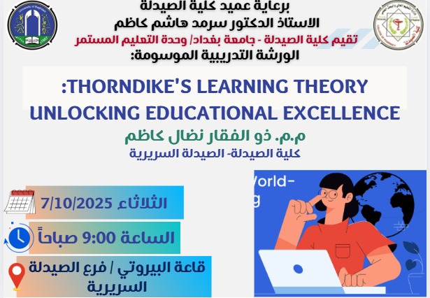 بإشراف السيد عميد كلية الصيدلة الأستاذ الدكتور سرمد هاشم الخطيب المحترم، أقامت وحدة التعليم المستمر في كلية الصيدلة / جامعة بغداد ورشة عمل حضورية بعنوان ” نظرية ثورندايك في التعلم: مفتاح التميز التعليمي”، ألقاها المدرس المساعد ذو الفقار نضال، التدريسي في فرع الصيدلة السريرية.
