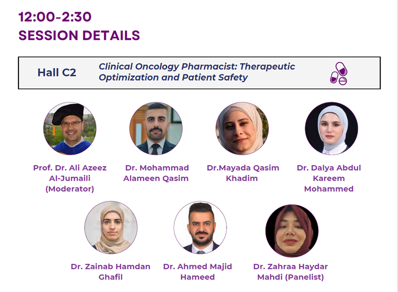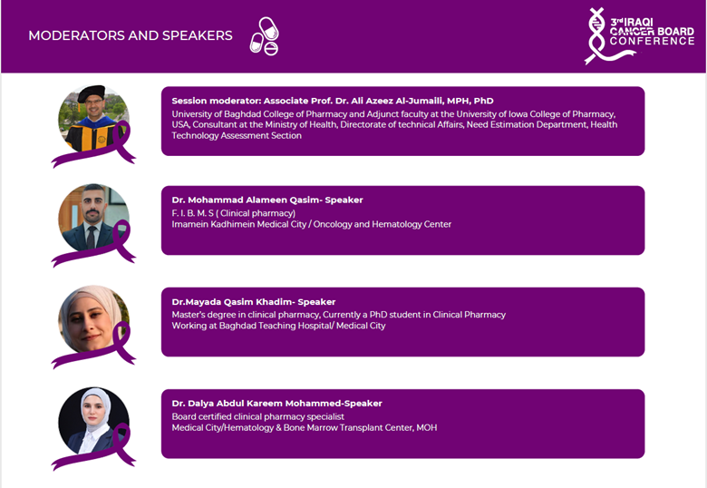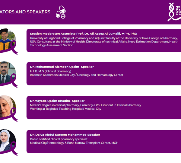 أدار الدكتور علي عزيز الجلسة الحوارية التي إستمرت لأكثر من ساعتين، وضمّت نخبة من صيادلة الأورام السريريين. وقد شهدت الجلسة تقديم ست محاضرات علمية من قبل صيادلة يمثلون مستشفيات عراقية متعددة، إستعرضوا خلالها خبراتهم العملية في مؤسسات مثل مدينة الطب، مستشفى الأورام، مراكز أمراض الدم، ومركز الجواد في مستشفى الكاظمية التعليمي، بمشاركة صيادلة من مختلف المحافظات، إمتدت من إقليم كردستان شمالاً إلى محافظة البصرة جنوباً.