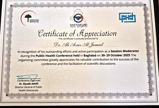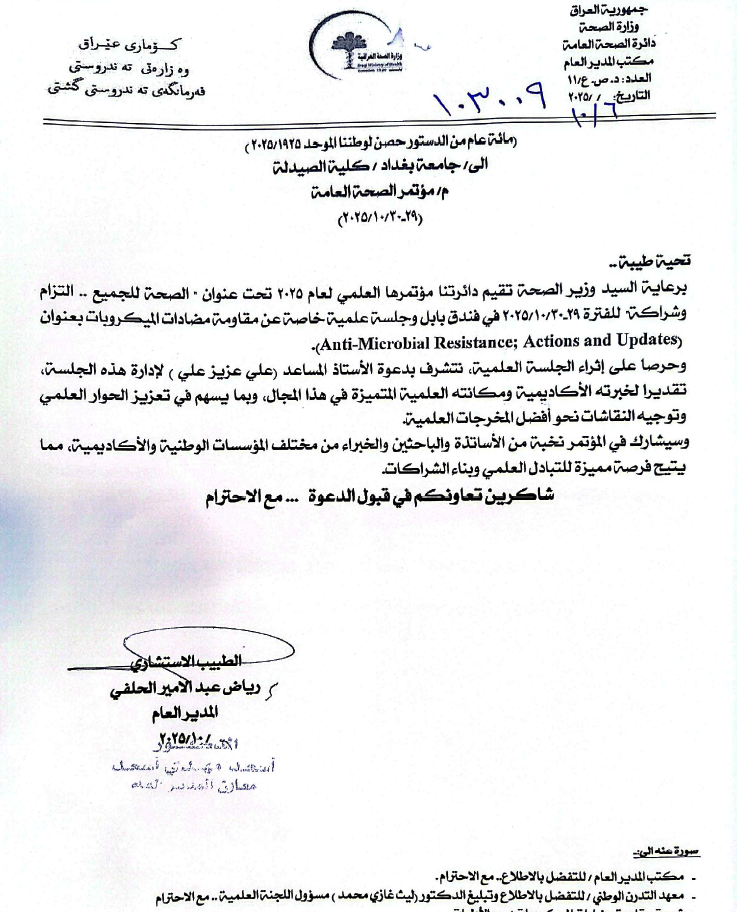 شارك الأستاذ المساعد الدكتور علي عزيز علي، التدريسي في فرع الصيدلة السريرية، كأحد مدراء جلسة “المقاومة البكتيرية للمضادات الحيوية” في مؤتمر الصحة العامة بدعوة رسمية من مدير عام دائرة الصحة العامة في وزارة الصحة في يوم 29 تشرين الأول 2025.
