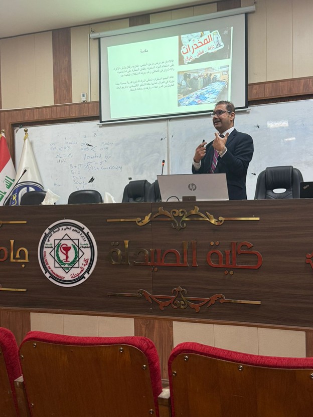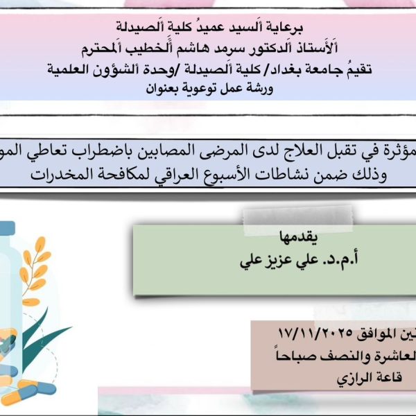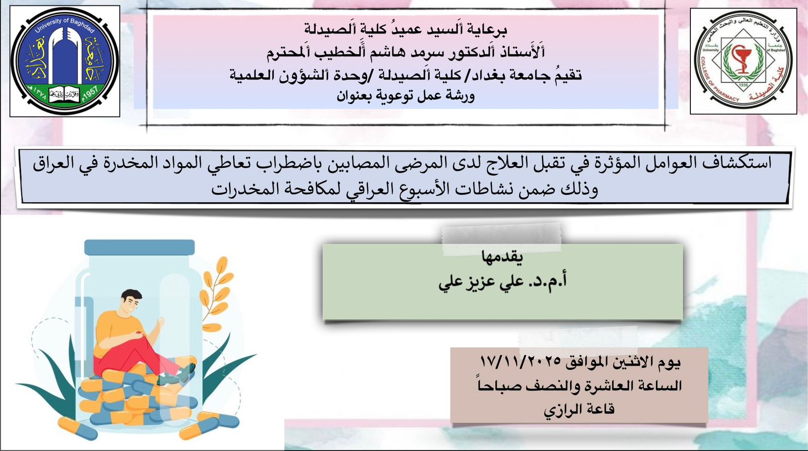 بإشراف السيد عميد كلية الصيدلة الأستاذ الدكتور سرمد هاشم الخطيب المحترم، أقامت وحدة الشؤون العلمية في كلية الصيدلة/ جامعة بغداد ورشة عمل حضورية بعنوان “إستكشاف العوامل المؤثرة في تقبّل العلاج لدى المرضى المصابين بإضطراب تعاطي المواد المخدرة في العراق” ألقاها الأستاذ المساعد الدكتور علي عزيز علي، التدريسي في فرع الصيدلة السريرية.