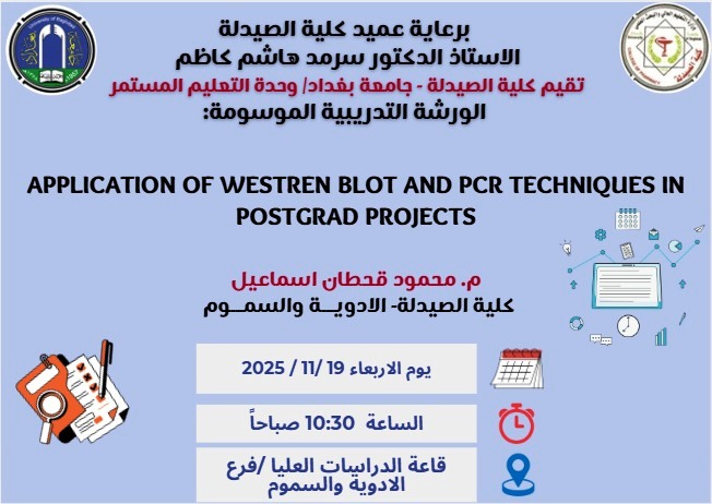 بإشراف السيد عميد كلية الصيدلة الأستاذ الدكتور سرمد هاشم الخطيب المحترم، أقامت وحدة التعليم المستمر في كلية الصيدلة/ جامعة بغداد ورشة عمل حضورية بعنوان “تطبيق تقنيات ويسترن بلوت و تفاعل البوليميراز المتسلسل في بحوث الدراسات العليا”، ألقاها المدرس محمود قحطان إسماعيل، التدريسي في فرع الأدوية والسموم. هدفت الورشة إلى توضيح طرق استخدام هذه التقنيات وبيان أهميتها في دعم البحوث المتقدمة.
