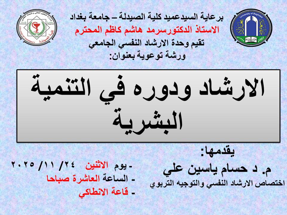 بإشراف السيد عميد كلية الصيدلة الأستاذ الدكتور سرمد هاشم الخطيب المحترم، أقامت وحدة الإرشاد النفسي الجامعي في كلية الصيدلة/جامعة بغداد ورشة توعوية حضورية بعنوان “الإرشاد ودوره في التنمية البشرية”، ألقاها المدرس الدكتور حسام ياسين علي، التدريسي بكلية العلوم الإسلامية / جامعة بغداد.