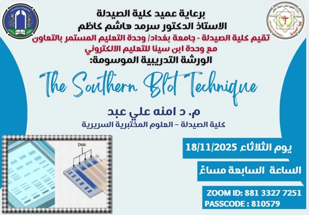 بإشراف السيد عميد كلية الصيدلة الأستاذ الدكتور سرمد هاشم الخطيب المحترم، أقامت وحدة التعليم المستمر بالتعاون مع وحدة ابن سينا للتعليم الالكتروني في كلية الصيدلة/ جامعة بغداد ورشة عمل الكترونية بعنوان “تقنية لطخة ساوثرن”، ألقتها المدرس الدكتور آمنة علي عبد، التدريسية في فرع العلوم المختبرية السريرية.