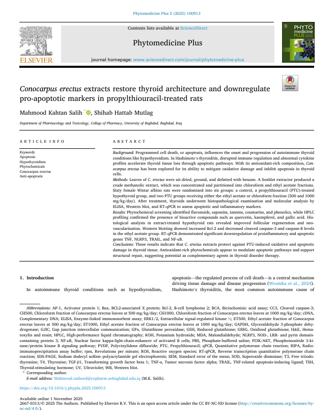 نشر الباحثان المدرس محمود قحطان إسماعيل والأستاذ الدكتور شهاب حطاب مطلك في فرع الأدوية والسموم نتائج بحثهما العلمي في إحدى المجلات العالمية الرصينة المصنفة ضمن الربع الأول والمعروفة بارتفاع معامل تأثيرها وقيمتها العلمية المرموقة. وقد ركّز هذا البحث على دراسة التأثيرات الوقائية لمستخلص أوراق نبات الدمس ضد قصور الغدة الدرقية المستحدث باستخدام عقار البروبيل ثايويوراسيل في الجرذان، وقد أظهرت التحاليل النسيجية والجزيئية تحسناً في بنية الجريبات الدرقية وزيادة في تكوين الأوعية الدموية لدى الجرذان التي عولجت بالمستخلص، مع ارتفاع مستوى البروتين المضاد لموت الخلايا المبرمج Bcl-2، وانخفاض واضح في جينات الالتهاب والموت الخلوي مثل TNF، NLRP3، TRAIL، NF-κB، caspase-3، وcaspase-8. تُعدّ هذه النتائج إضافة علمية متميزة تشير إلى إمكانية استخدام مستخلصات أوراق نبات الدمس كعلاج مساعد ضد أمراض الغدد الصم، ومنها اضطرابات الغدة الدرقية.