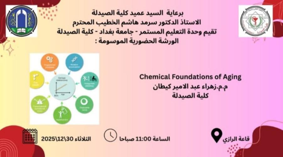 بإشراف السيد عميد كلية الصيدلة الأستاذ الدكتور سرمد هاشم الخطيب المحترم، أقامت وحدة التعليم المستمر في كلية الصيدلة/ جامعة بغداد ورشة عمل حضورية بعنوان ” الأساس الكيميائي للشيخوخة”، ألقتها المدرس المساعد زهراء عبد الأمير كيطان، التدريسية في فرع الكيمياء الصيدلانية.