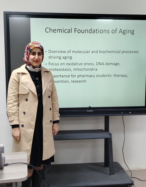 هدفت الورشة إلى توضيح الأسس الكيميائية والجزيئية لعملية الشيخوخة وشرح الآليات الحيوية المصاحبة لتدهور وظائف الخلايا مع التقدم في العمر، كما وأبرزت أهميتها لطلبة الصيدلة في مجالات الوقاية والعلاج والبحث العلمي.