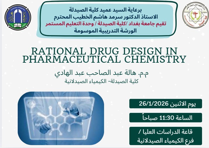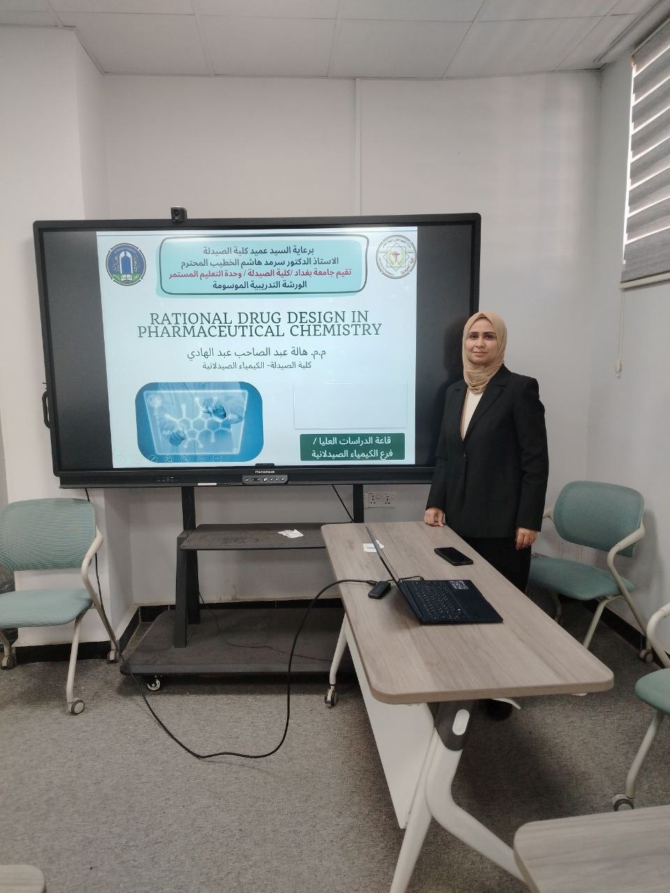 بإشراف السيد عميد كلية الصيدلة الأستاذ الدكتور سرمد هاشم الخطيب المحترم، أقامت وحدة التعليم المستمر في كلية الصيدلة/جامعة بغداد ورشة عمل حضورية بعنوان “التصميم المنطقي للأدوية في الكيمياء الصيدلانية”، ألقتها المدرس المساعد هالة عبد الصاحب، التدريسية في فرع الكيمياء الصيدلانية