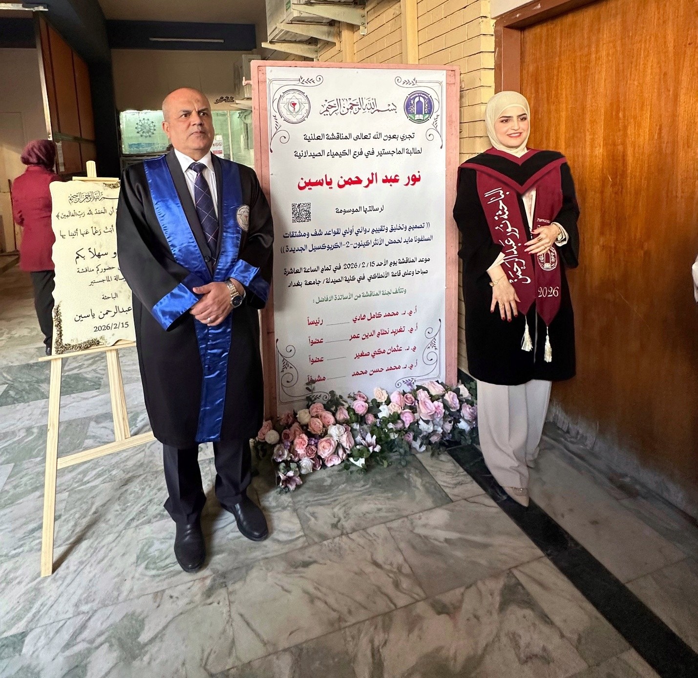 ناقشت كلية الصيدلة رسالة الماجستير الموسومة “تصميم وتخليق وتقييم دوائي أولي لقواعد شف ومشتقات السلفونامايد لحمض الأنثراكينون-2-الكربوكسيل الجديدة “، للطالبة نور عبد الرحمن ياسين ومشرفها الأستاذ المساعد الدكتور محمد حسن محمد في فرع الكيمياء الصيدلانية.